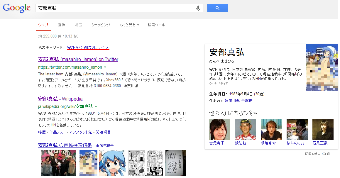 google chromeで安部真弘で検索かけると右になんかひどいのが出る。多分適当に自動で画像拾ってきてるんだろうけど、悪意を感じる