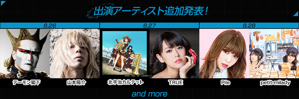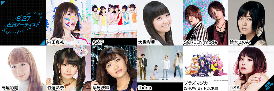イヤホンズ/内田真礼/A応P/大橋彩香/北宇治カルテット/SCREEN mode/鈴木このみ/高垣彩陽/竹達彩奈/TRUE/早見沙織/fhna/FLOW/プラズマジカ(SHOW BY ROCK!!)/LiSA 他(50音順)